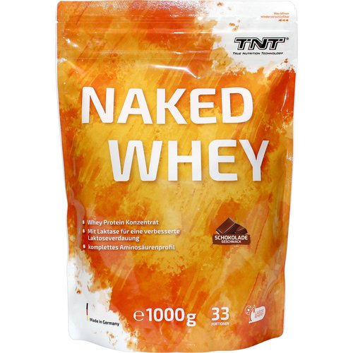 TNT Naked Whey hat abhängig von der gewählten Geschmackssorte bis zu 78% Proteingehalt und enthält nur einen geringen Anteil an Kohlenhydraten und Fett. Es ist zudem laktosearm und enthält kein Aspartam. Das Pulver löst sich sehr gut auf, so dass mit einem Shaker (z.B. mit dem TNT Shaker) schnell und einfach leckere Shakes zubereitet werden können. Das TNT Naked Whey eignet sich ideal für einen Post-Workout-Shake, um den Körper schnell wieder mit Energie zu versorgen. Es kann aber auch zu jeder Tageszeit dazu verwendet werden um den benötigten Tagesbedarf an Eiweiß zu decken. Diese hochwertige Proteinquelle eignet sich besonders gut für alle Sportler, z.B. Bodybuilder, Fitnesssportler. Sie ist reich an verzweigt-kettigen Aminosäuren (BCAAs). Externe Analyse-Zertifikate: Bestätigte Qualität TNT Naked Whey wurde nach der Produktion von einem externen Prüflabor getestet, um die Nährwerte zu überprüfen. TNT Naked Whey wurde zusätzlich mikrobiologisch auf Verderbnis- und Krankheitserreger getestet. *Für Menschen mit Laktoseunverträglichkeit besser geeignet Normalerweise ist ein Whey-Protein-Konzentrat für Menschen mit Laktoseintoleranz nicht zu empfehlen. Anders beim TNT Naked Whey. Hier konnte man durch den Einsatz von Laktase das TNT Naked Whey auch für Kunden mit Laktoseintoleranz verträglicher machen! Wir möchten jedoch darauf hinweisen, dass das Laktaseenzym bei einer Temperatur von 40 Grad Celsius oder mehr an Wirksamkeit verliert. Je höher die Temperatur, desto höher ist auch der Verlust der Wirksamkeit. 1000g = ca. 33 Portionen Zubereitung von TNT Naked Whey: 30g Pulver mit 200ml kaltem Wasser in einem Mixer oder Shaker zubereiten.