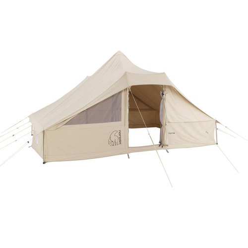 Glamping für 6 Personen - Nordisk Utgard 13.2 Baumwollzelt Allgemeine Produktdetails Campingzelt Konstruktion: Einwand geeignet für: bis zu 6 Personen unkomplizierter, schneller Aufbau rechteckige Form mit hohem Dachspitze im mittleren Bereich bietet viel Platz naturbelassenes Material sorgt für hohe Atmungsaktivität und ausgeglichenes Klima 2 sich gegenüberliegende Eingänge 2 große Fenster inklusive Vorhängen und Moskitonetz vorn und hinten Fensterhaken als Befestigung an der Abspannleine sorgt für kleine Sonnendächer 2 kleine Fenster an den Stirnseiten (Schlafbereichen) mit Moskitonetz und Vorhang verstellbares Mittelgestänge mit D-Ring als Befestigungspunkt zum Einhängen der Ausrüstung integrierte Befestigungspunkte zum Einhängen der Ausrüstung im Zeltinneren Lieferumfang und Zubehör-Info: siehe unten inklusive praktischer Verstau- und Transportttasche Logo-Details Technische Daten, Maße und Material Personenanzahl: 6 Wassersäule: 350 mm Gewicht: 22,5 kg Anzahl Schlafraum: 2, optional 1 Anzahl Wohnraum: 1 Maße aufgestellt (B x L x H): 430 x 295 x 240 cm Packmaß (L x B): 124 x 35 cm Material Überzelt: 65% Polyester, 35% Baumwolle schweres Zelttuchgewebe mit atmungsaktiver Beschichtung, Gewicht: 200 g/m2 Material Gestänge: Stahl Material Heringe: Stahl Abspannleinen: Polyester Lieferumfang: 1 Zelt mit Tasche, Abspannleinen, Gestänge, Heringe Hinweis: der Zeltboden und/oder die Kabinen können optional dazu gekauft werden und sind nicht im Lieferumfang enthalten! (komplette Ausstattung s. Bild 4) Utgard: Die Geschichte hinter dem Namen Utgard bedeutet Außenwelt" und war in der alten nordischen Mythologie eine Hochburg der Riesen in Jotunheim. Utgard wurde von Loke, einem großen und hinterhältigen Gigant, der Thor mit einem manipulierten Wettbewerb in der Außenwelt bekämpfte, beherrscht. Es ist die letzte der 3 Welten, die mit Yggdrasil zusammenhängen, welches sich abgesehen von Utgard aus Asgard, die Heimat der Götter und Midgard, die Heimat der Menschen, zusammensetzt."